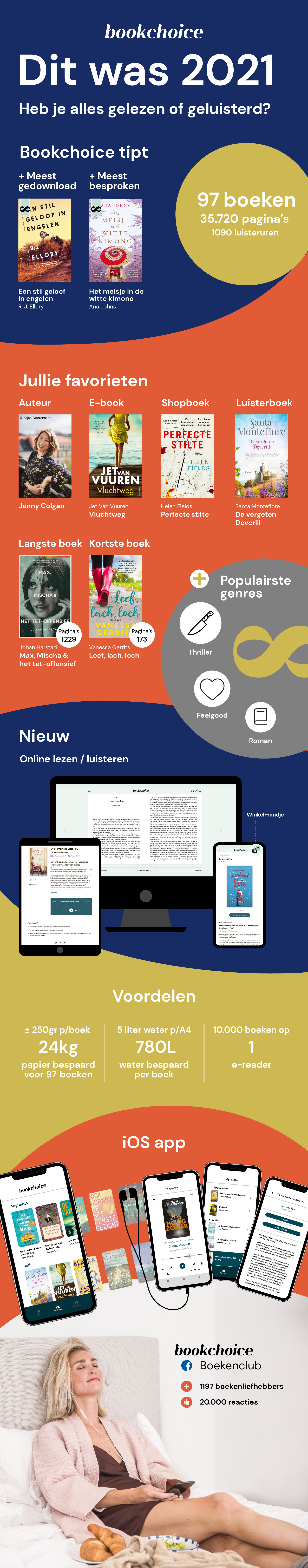 In 2019 stonden er 97 selectieboeken voor jullie klaar. Want naast de 96 boeken uit de selectie, kreeg je in 2021 ook een extra boek: de allereerste Bookchoice Original van Noortje Brink. Dit komt neer op 35.720 pagina's in totaal. Wow! Als je een veellezer bent en alle boeken leest, heb je dus flink wat pagina's verslonden. En als je alle luisterboeken uit 2021 zou luisteren, dan ben je 1090 uur zoet.